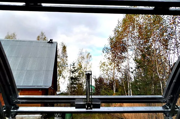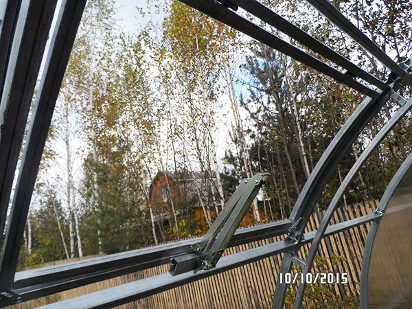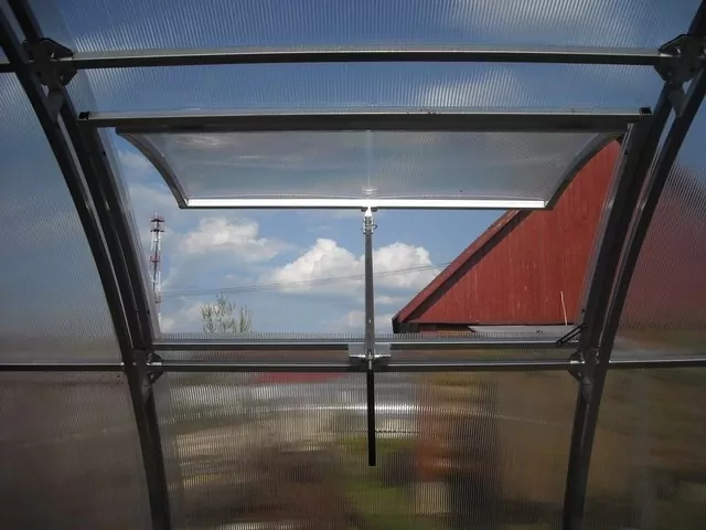 Принцип работы системы "автоматической форточки" основывается на нагревании жидкости в термоцилиндрe под воздействием солнечного теплa. Нагреваясь, жидкость расширяется, вследствие чего приводится в движение поршень, открывающий форточку. При снижении температуры воздуха вечером или при похолодании, объем жидкости уменьшается и форточка закрывается. Такой автомат для проветривания может функционировать в любой тепличной конструкции, а его установка в форточке настолько проста, что ее можно произвести самостоятельно. Форточка открывается на диапазон до 45 см.