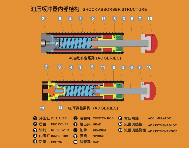 Серия AC: Так же называется амортизатором с автоматическим компенсационным механизмом, относится к нерегулируемым масляным амортизаторам. Он обладает функцией автоматической регулировки давления и способен адаптироваться к изменениям скорости столкновения и веса движущегося объекта, создавая мягкий эффект амортизации.