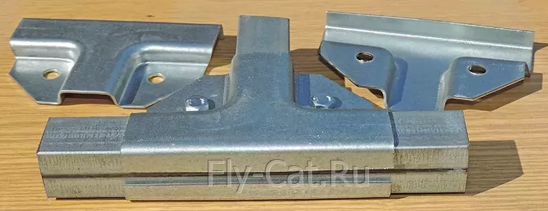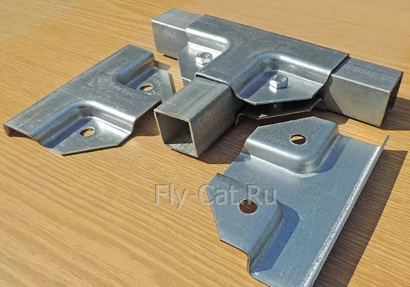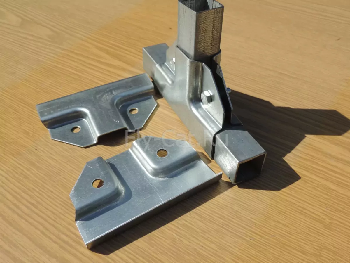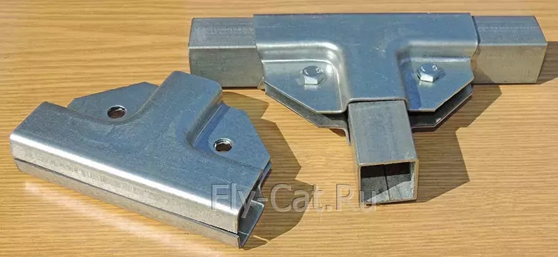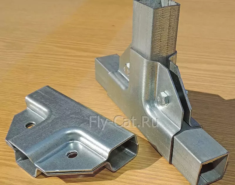 Универсальное крепление состоит из двух половинок, для соединения которых используются болты и гайки. Форма этого крепления даёт возможность надежно обхватить профильную трубу с каждой стороны. Полка крепежа имеет 3 размера 25х25х25. Толщина оцинкованного металла 1.2 мм, отверстие под болт М6 с перфорацией для саморезов или толщиной 1,5 мм цинк, отверстие под болт М8 без перфорации. Таким крепежом можно соединить трубы одинакового сечения размером 25х25 мм.