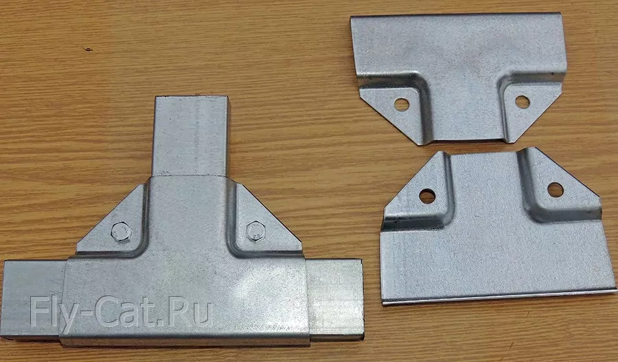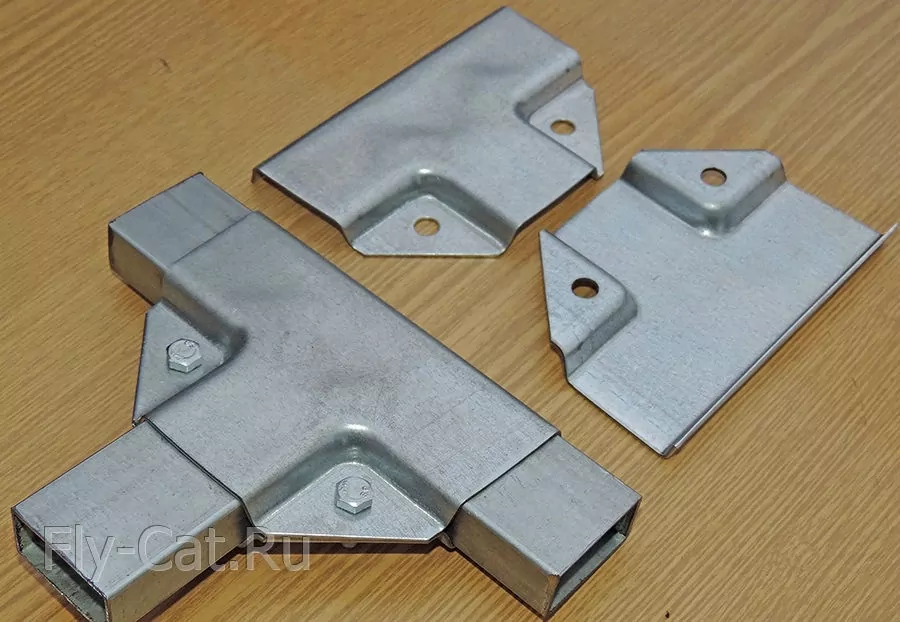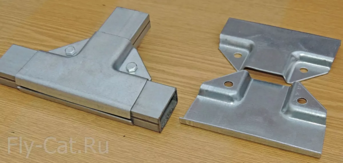 Универсальное крепление состоит из двух половинок, для соединения которых используются болты и гайки. Форма этого крепления даёт возможность надежно обхватить трубы одинакого сечения. Полка крепежа имеет 3 размера 40х40х40. Толщина оцинкованного металла 1.5 мм. Таким крепежом можно соединить трубы с одинаковым сечением. Трубы с разным сечением, таким крепежом соединить нельзя.