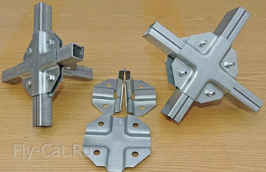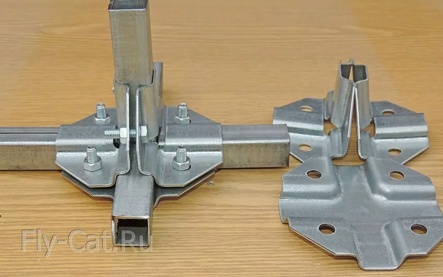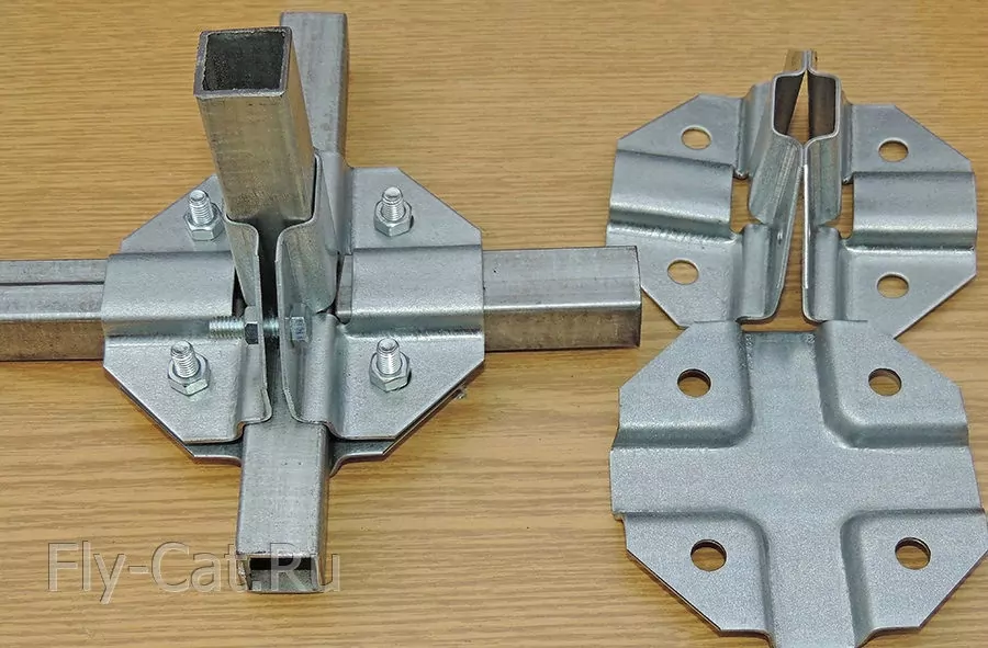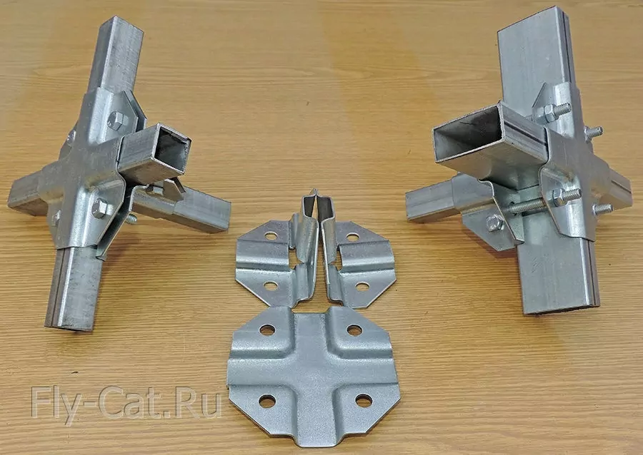 Краб-система крепежа угол на 5 сторон состоит из трёх частей, для соединения которых используются болты и гайки. Форма этого крепления даёт возможность надежно обхватить профильную трубу с каждой стороны.