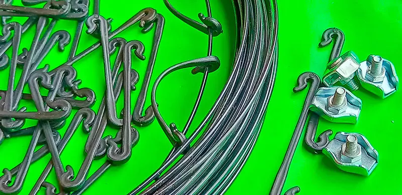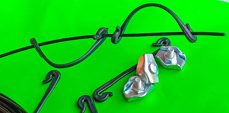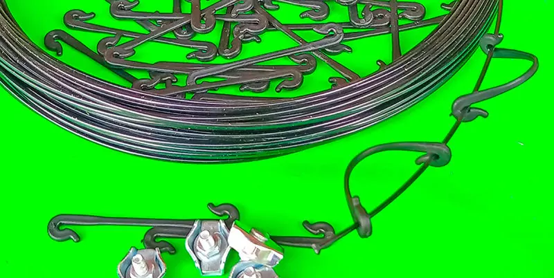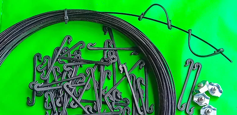 - В набор входит пластиковая проволока (агрошпалера для виноградников 30м толщиной 1.8 мм цвет чёрный, прочность на разрыв 125 кг. Практична в использовании, не ржавеет, не растягивается, очень стойка к химикатам и удобрениям. Защищина от УФ воздействия)